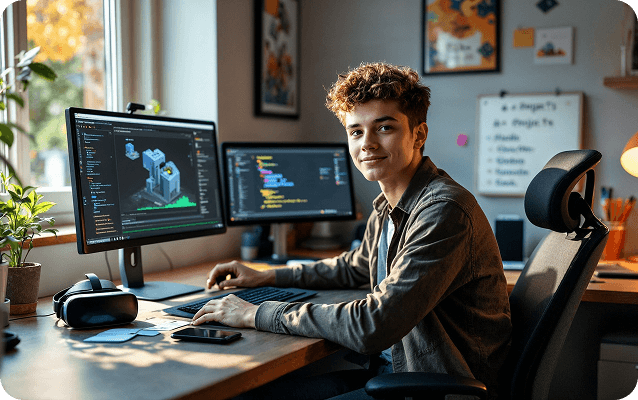 Курс готовит подростков к первому шагу в игровой индустрии. Учащиеся создают собственные 2D, AR и VR-игры, изучают Unity и программирование на C#. В программу встроены AI-инструменты для генерации локаций, персонажей и кода. Учеба полностью практична — с готовыми игровыми проектами на выходе.